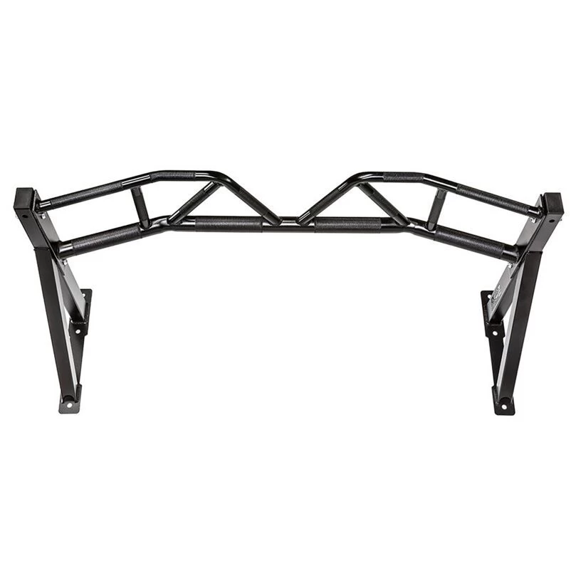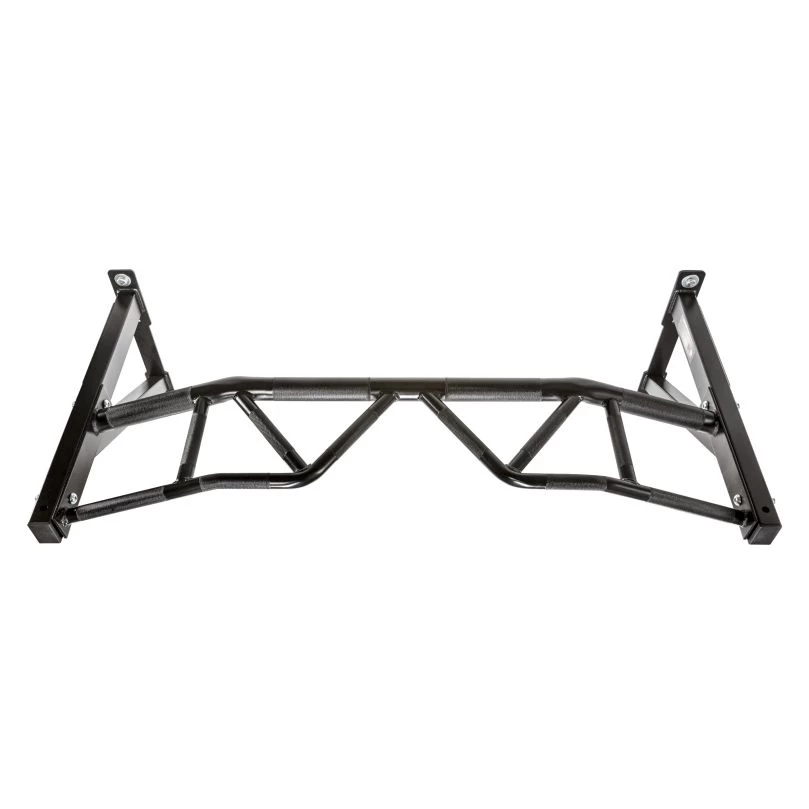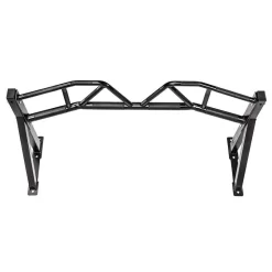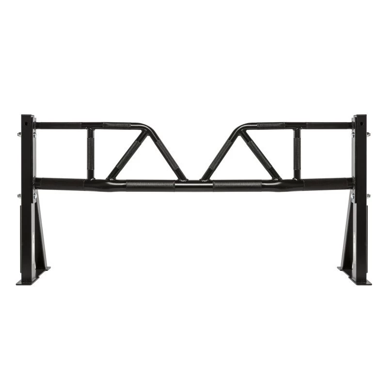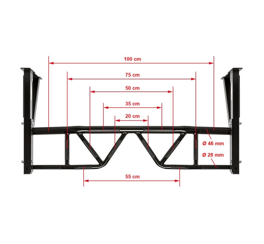 Die Klimmzugstange tritt in Studioqualität und mit vielfältigen Griffvariationen auf. Mit der V-förmigen Aussparung kann sowohl die hintere Griffleiste (Ø 46 mm) als auch die vordere (Ø 28 mm) komplett genutzt werden.