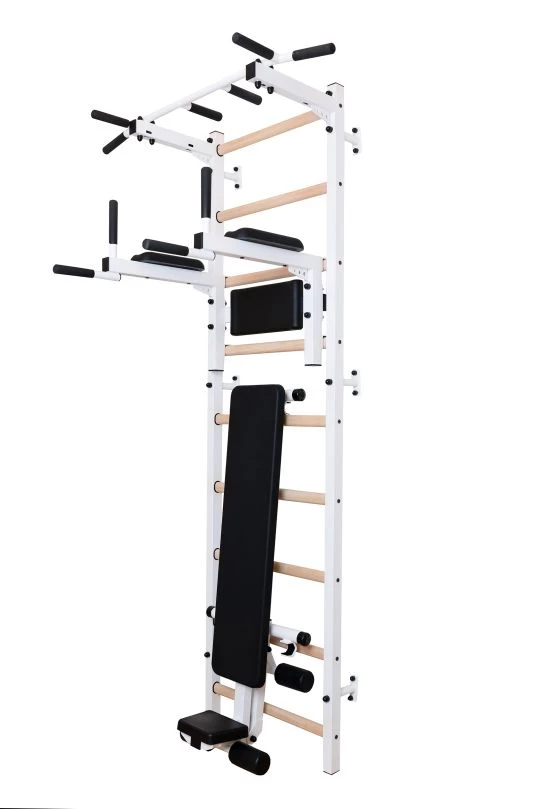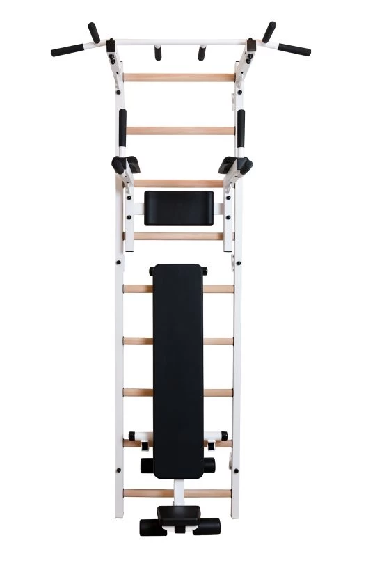 Hochwertige Sprossenwand in den Maßen 67 x 240 cm mit Metallprofilen und 9 ovalen Buchenholz-Sprossen (30 x 40 mm). Die Sprossenwand entspricht den Normen EN 913 und EN 12346 und muss an die Wand montiert werden. Tolles Sportgerät und ideal auch für den Heimgebrauch. Mit fest angebrachter Klimmzugstange aus Metall, einer verstellbaren Dip-Station mit Rückenpolster und einhängbarer Trainingsbank für ein umfangreiches Ganzkörpertraining.