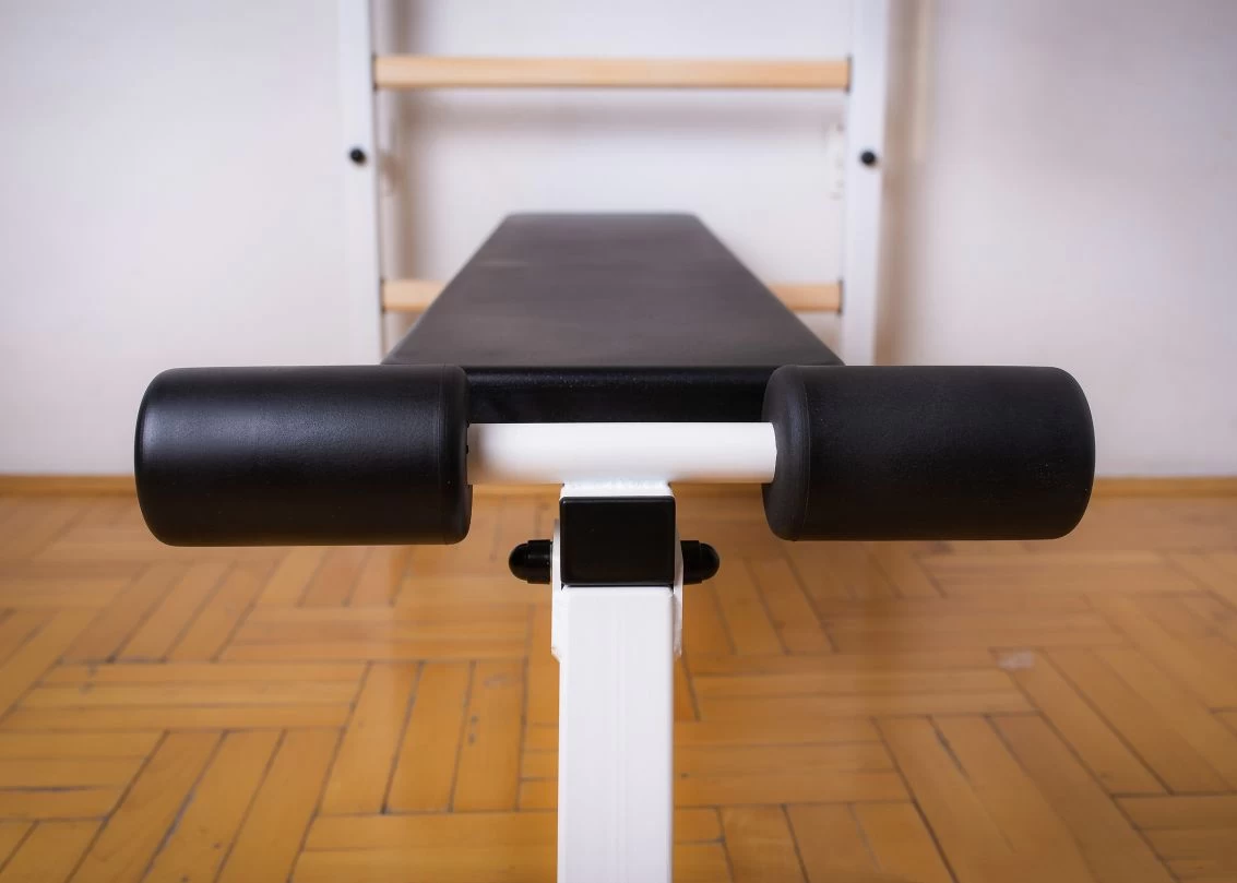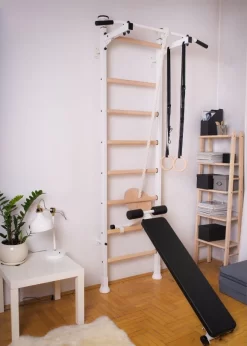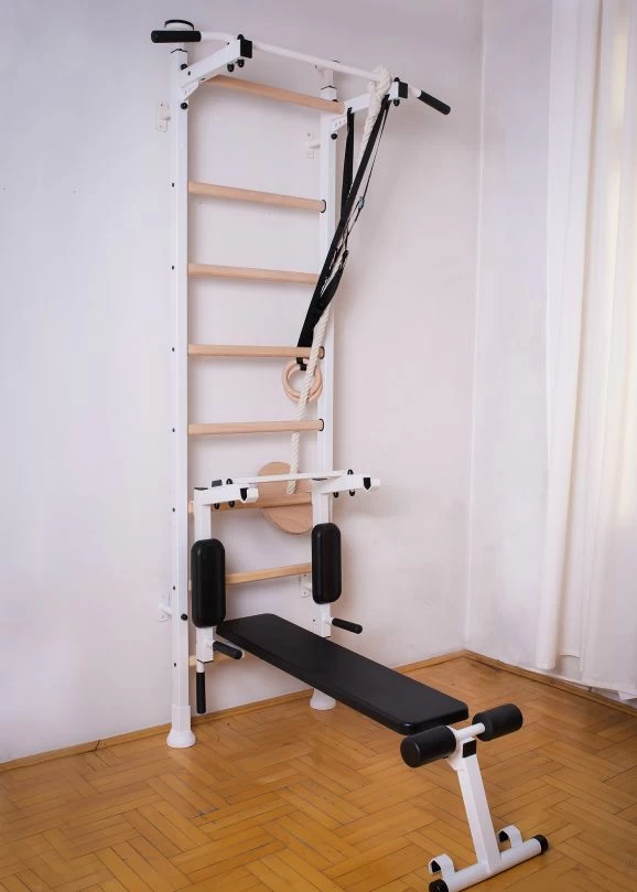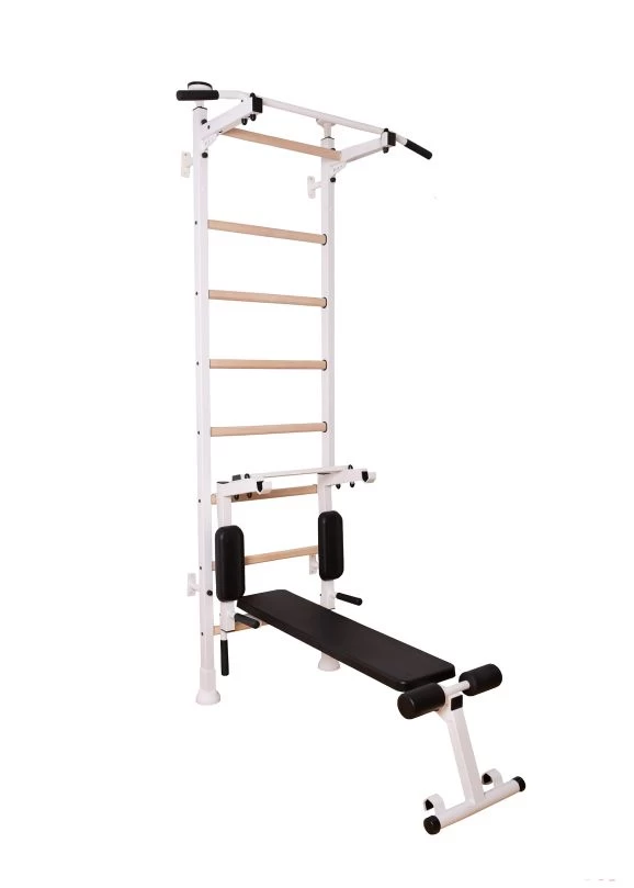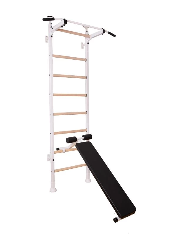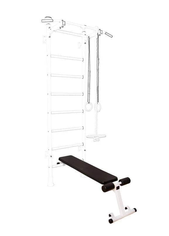 Trainingsbank als optionales Zubehör für die BenchK-Sprossenwände der Serie 500. Die Bank ist an beiden Seiten in der Sprossenwand einhängbar, wodurch auch ein Training mit positiver oder negativer Neigung ermöglicht wird.