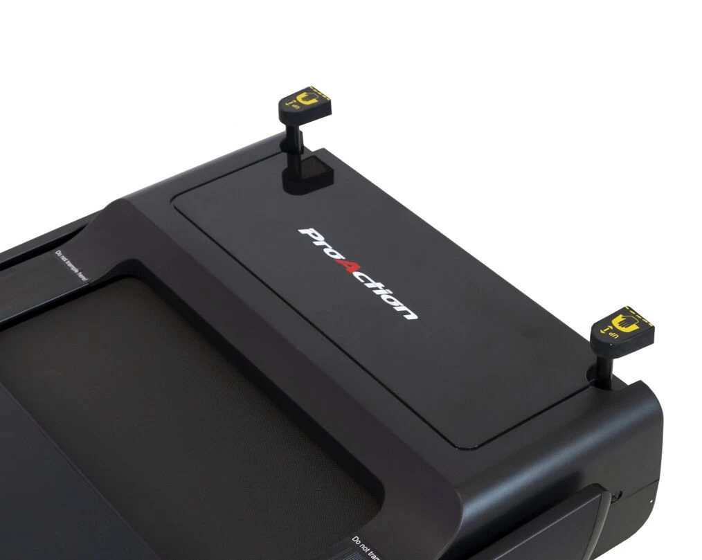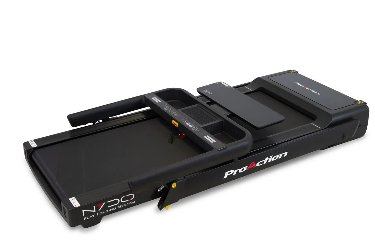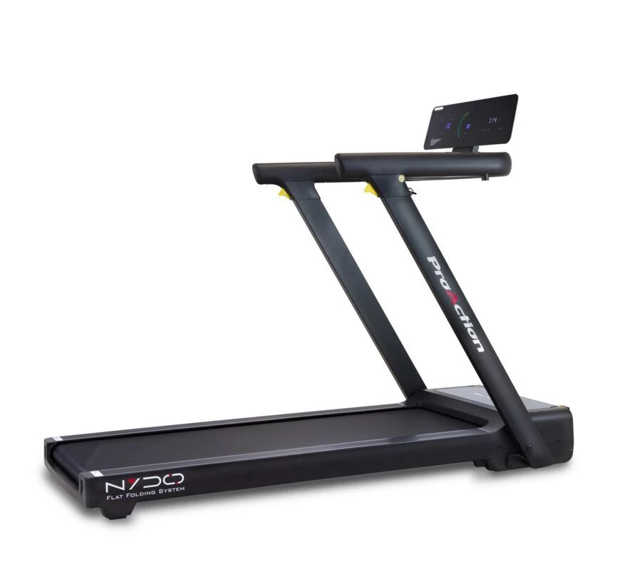 Das Laufband zeichnet sich durch seine geräumige Lauffläche, ein stabiles und angenehmes Laufgefühl, einen übersichtlichen Bildschirm mit allen wichtigen Funktionen und das spezielle Klappsystem aus. Die Geschwindigkeit lässt sich von 1-18 km/h, die Steigung von 0-12% variieren. Das 3-fach-Dämpfsystem sorgt für ein sanftes Auftreten. Die Herzfrequenzmessung kann mithilfe der Handkontaktmesser am Gerät oder eine Bluetooth-Verbindung zu Messgurten erfolgen. Über iConcept kann eine Verbindung zum Handy oder Tablet hergestellt werden, um verschiedene Lauf-Apps in das Training einzubinden. Nach dem Training lässt sich das NYDO Proaction durch seine besonders kleinen Klappmaße platzsparend im Stehen oder Liegen verstauen.