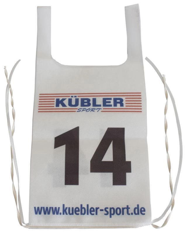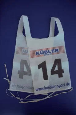 Die schwarzen Ziffern auf weißem Vließ sind von vorne und hinten leicht erkennbar. Die Doppelstartnummern zeichnen sich durch eine einfache Befestigung durch seitliche Bändchen aus. Sie haben eine hohe Reißfestigkeit und einen hohen Tragekomfort. Die Leibchen sind mehrfach einsetzbar, aber nicht waschbar.