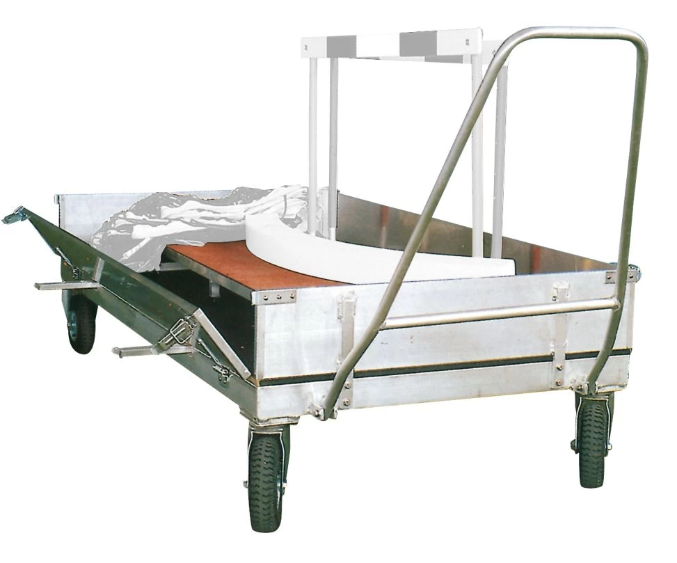 Hochwertiger Transportwagen aus Aluminium für den einfachen Transport von Sportgeräten. Mit den Maßen: 1 x 2 m und einer Tragkraft von ca. 1000 kg ist er vielseitig einsetzbar. Die Seitenteile mit angebrachten Stützen lassen sich aufklappen und sorgen somit für eine mühelose Beladung. Der Transportwagen ist ausgestattet mit luftbereiften Rädern und ist vorn lenkbar.