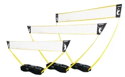Mobiles Netz für 3 Sportarten in einem praktischen Transportkoffer zum Mitnehmen. Das Hammer 3 in 1 Freizeit-Netz ist ideal für den Strand, den Garten, den Pausenhof oder auch die Sporthalle geeignet. Die Teleskop-Netzpfosten können je nach Wunsch und in Sekundenschnelle auf die Höhe von einem Volleyballnetz (2,24 m Höhe), einem Badmintonnetz (1,55 m Höhe) oder einem Tennisnetz (1,02 m Höhe) eingestellt werden. Der Tragekoffer, der zugleich auch der Netzständerist, läst sich leicht transportieren und verstaut das Set innerhalb von kurzer Zeit. Aufgrund der elastischen Netzpfosten ist jederzeit eine gute Netzspannung garantiert. Im Set sind 3 u-förmige Bodennägel enthalten, welche zur zusätzlichen Bodenverankerung des Pfostenständers (Koffers) dienen.