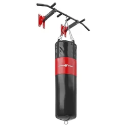 Die Klimmzugstange kann mit 8 Montagebohrungen sowohl in der Wand als auch in der Decke befestigt werden und trägt eine Gewichtsbelastung von 150 kg. Verschiedene Griffe und eine Aufhängung für einen Boxsack bieten unterschiedlichste Trainingsmöglichkeiten.