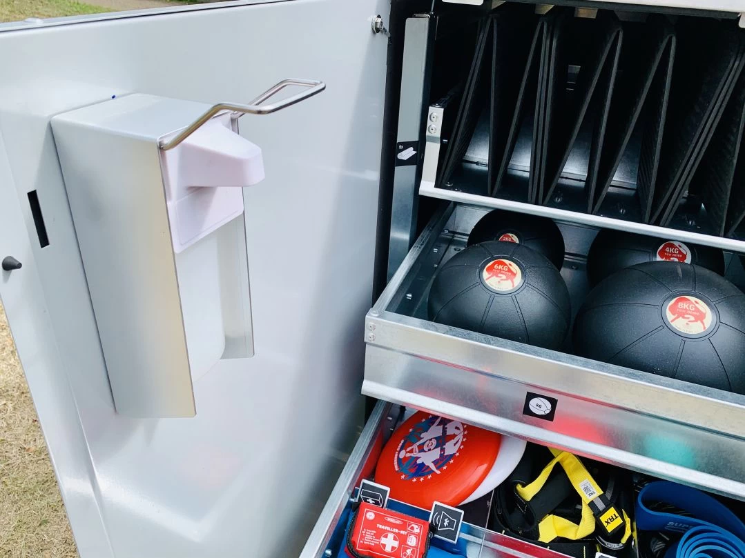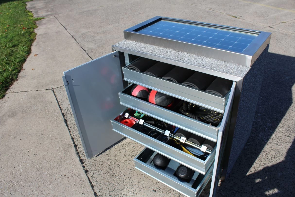 Mit der Sportbox ist es möglich für Sportler Trainingsequipment auf öffentlichen Sportstätten auf Leihbasis zur Verfügung zu stellen. Der Zugang erfolgt per APP – innovativ, zugangsreguliert und sicher. Die Sportbox ist perfekt geeignet für öffentliche Sportstätten und Parks, Vereine, Schulen und Universitäten, Wohnanlagen und Betriebssporteinrichtungen. Die Sportbox funktioniert autark und ist umweltfreundlich und einfach zu installieren. Der Inhalt lässt sich individuell gestalten.