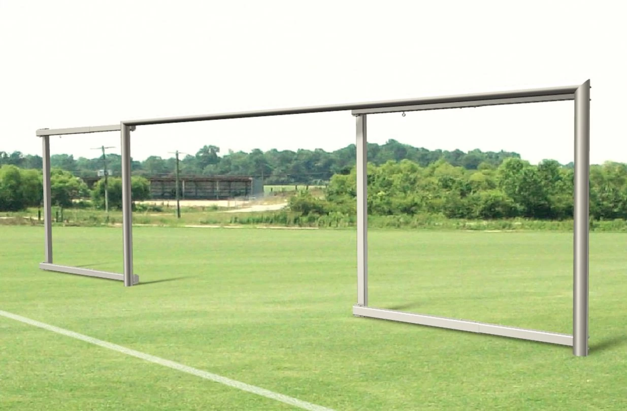 Das Schwenktor (Jugendtor 5×2 m) ist in Bodenhülsen außerhalb des Spielfeldes einbetoniert und kann durch das angebrachte Rollsystem von einer Person problemlos zur Seite geschwenkt werden. Der Bodenrahmen ist hochklappbar und ein Aluminium-Rechteckprofil mit 75 x 50 mm. Die hintere Torhalterung ist ebenfalls ein Rechteckprofil mit den Maßen 80 x 80 mm. Die Einstecktiefer der Bodenhülsen ist 350 mm.