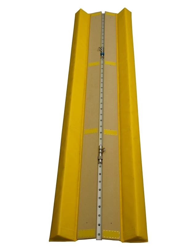 Zwei Keile aus Polyethylen-Leichtschaumstoff mit Überzug aus Planenstoff auf Holzplatte. Klappbar.