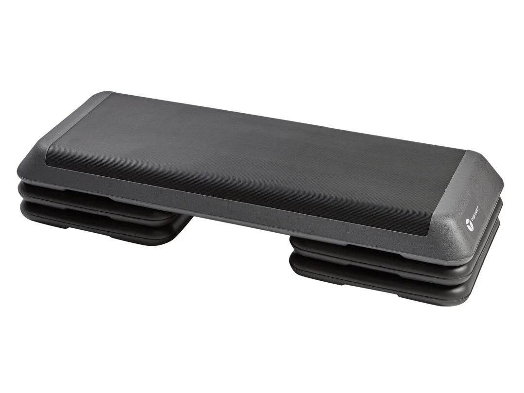 Solider Stepper für die Verwendung beim Fitnesstraining in verschiedensten Kursen oder beim Training im Fitnessstudio. Er bietet eine große, rutschhemmende Auftrittsfläche und ist für einen guten Stand mit 8 Gummipads auf der Unterseite ausgestattet. Enthalten sind ebenfalls 4 Blocks, mithilfe derer man die Höhe der Auftrittsfläche einfach und schnell von 10 auf 15 bzw. 20 cm erhöhen kann.