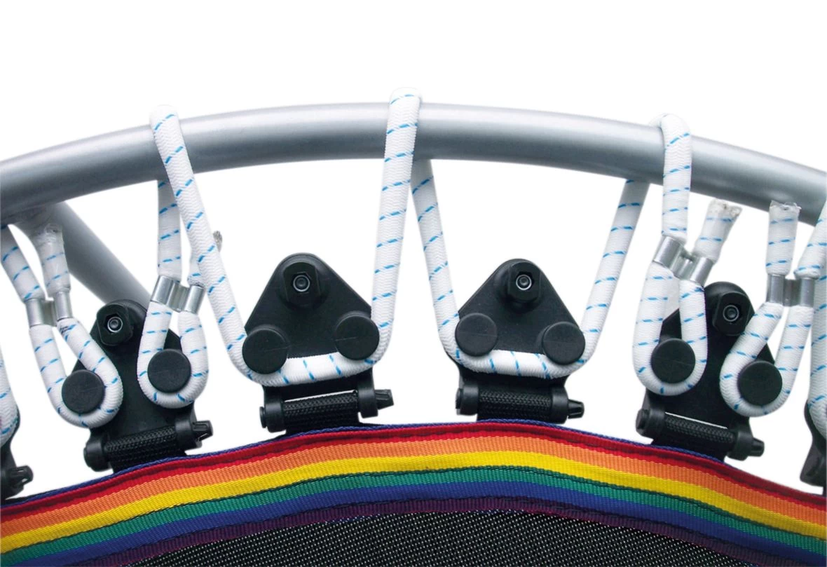Die Gummiseile sind in 5 verschiedenen Farben erhältlich und durch ihre spezielle Ummantelung besonders langlebig. Die Sprungmatte hat durch die fünffache Vernähung am Sprungmattenrand ebenfalls eine hohe Lebensdauer.